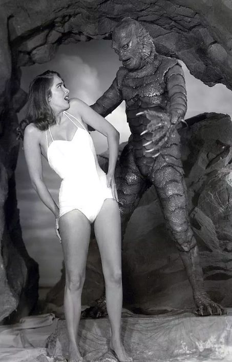 到了1954年,《黑湖妖谭》拍摄,鱼人第一次登上了大银幕,当然是作为恐怖片的主角。它拥有水陆两套呼吸系统,坚韧的皮肤和锋利的爪子,看上去像个外星人。这个怪家伙像金刚一样喜欢绑架美女,而且更加神出鬼没,这让当时的观众吓得不轻,《黑湖妖谭》三部曲成为早期恐怖片的经典。