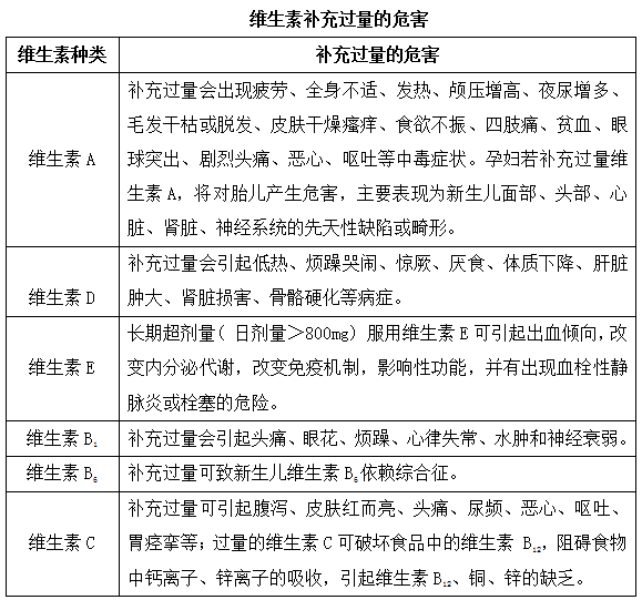 维生素是维持人类机体的正常代谢功能所必需的一类活性物质,主要用于机体的能量转移和代谢调节,部分维生素体内不能自行合成,须从食物中摄取。维生素按理化性质可分为脂溶性维生素和水溶性维生素。脂溶性维生素包括维生素A、维生素D、维生素E等,它们易蓄积于体内,一定不可超剂量应用;水溶性维生素包括B族维生素和维生素C等,与脂溶性维生素相比较,水溶性维生素一般容易排泄,不易蓄积,且无毒,若过量服用,也可以很快被排出体外,但是长期大剂量应用也会引起各种不良反应。