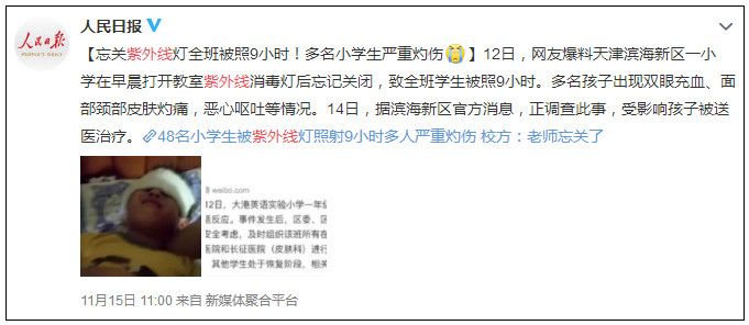 教室里的紫外线消毒灯忘记关闭,致使全班学生被紫外线灯照射9小时,数名小学生面部、颈部,尤其是眼睛被灼伤……