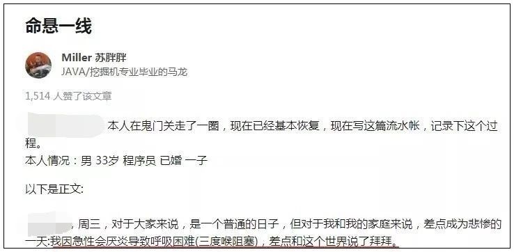 日前,知乎上一篇文章引起了很多人的关注,33岁的程序员小马,详细描述了自己突发“急性会厌炎”后的救治全过程。