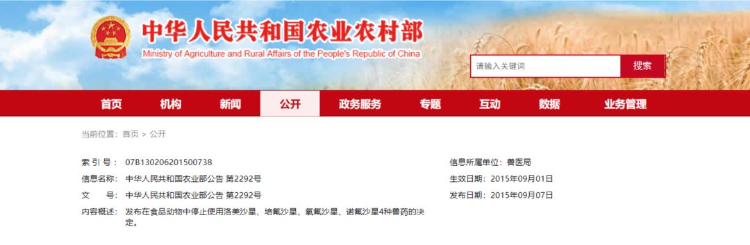 禁用抗生素的文件。图片来源:农村农业部官网
