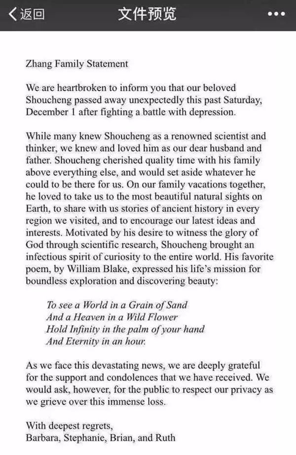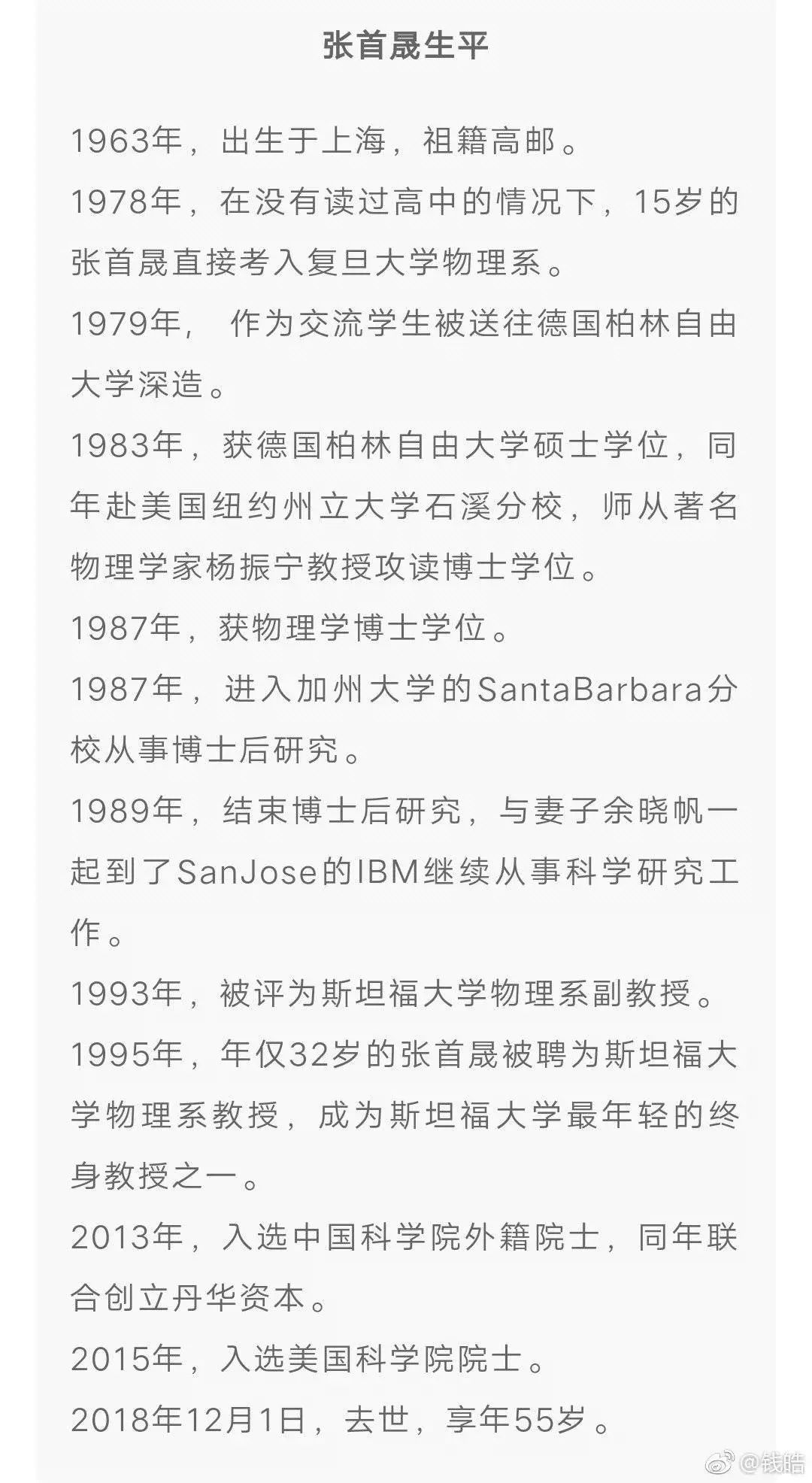 就在今天上午,美国华裔物理学家,美国斯坦福大学终身教授、美国科学院院士、中科院外籍院士张首晟的家人发布声明,确认张首晟于12月1日因抑郁症意外去世。张首晟家人在讣告中称,“在我们得到这一消息时,我们对大家的支持与慰问深表感谢。”