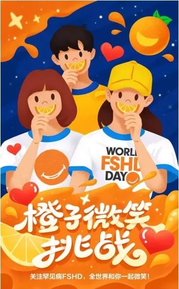 6月20日是世界FSHD关爱日,抖音联合罕见病发展中心、你并不孤单FSHD组织,共同发起橙子微笑挑战接力,即用嘴吸橙子5秒钟,然后微笑并@其他人接受挑战,被邀者需在24小时内接受挑战。