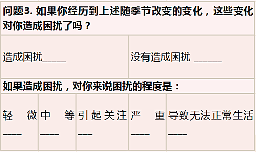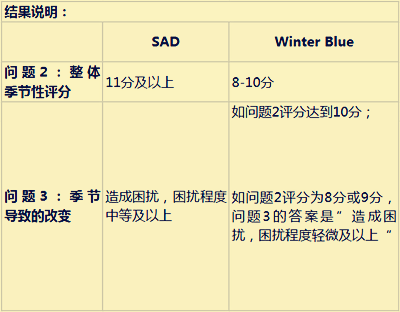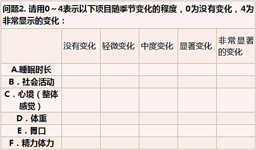 由Rosenthal和他的同事在1984年编的SPAQ(Seasonal Pattern Assessment Questionnaire)问卷被广泛应用于诊断SAD中。这一问卷包含6个题目,可免费下载并自主测试。通过回答问题2和3,可快速判断出自己是否属于SAD或Winter Blue。