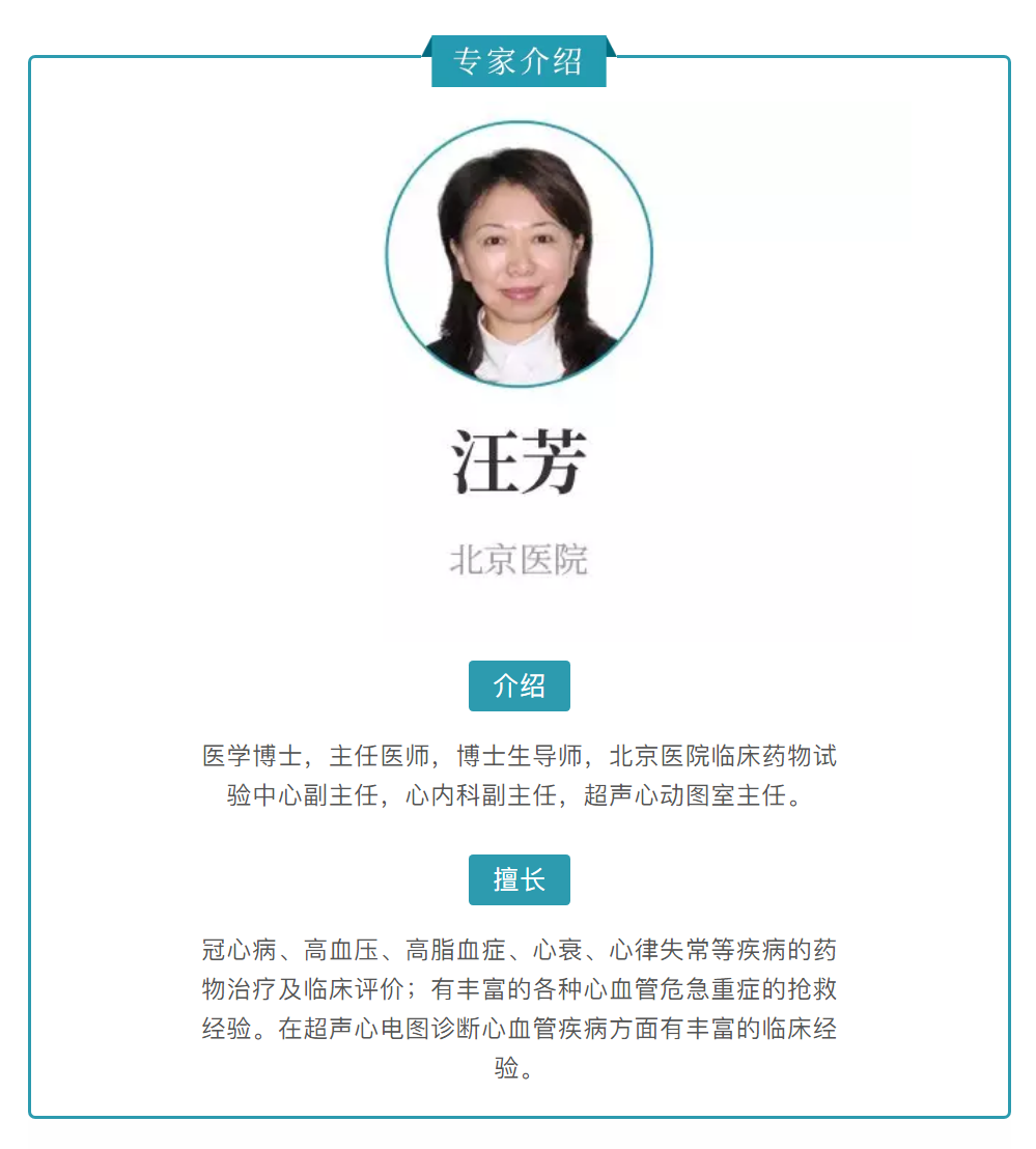 文字:北京医院临床药物试验中心副主任、心内科副主任、超声心动图室主任汪芳