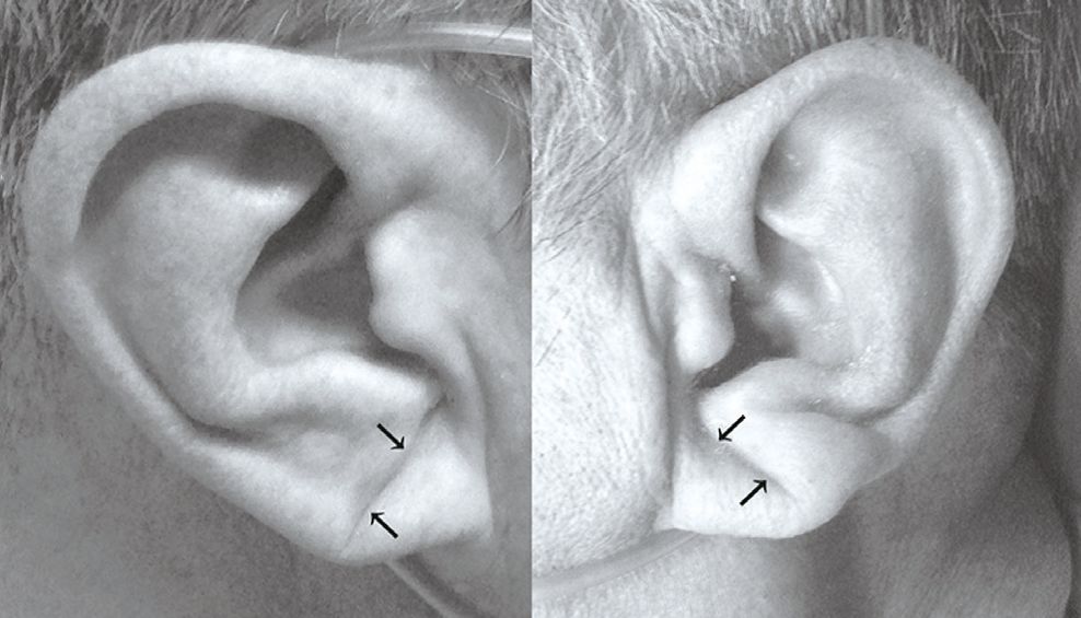 很简单,就是耳垂上出现的褶皱。说得再通俗易懂一点,就是耳垂上不是那么平滑,出现皱褶了!像这样: