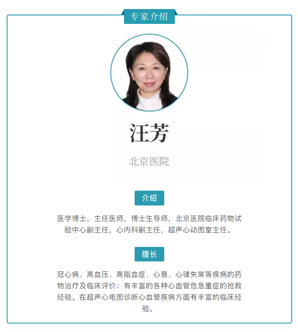 文字:北京医院临床药物试验中心副主任、心内科副主任、超声心动图室主任汪芳