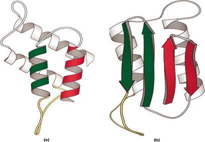 图(a)是具有α螺旋的蛋白质的正常折叠,图(b)是β折叠的感染性蛋白质的朊病毒折叠
