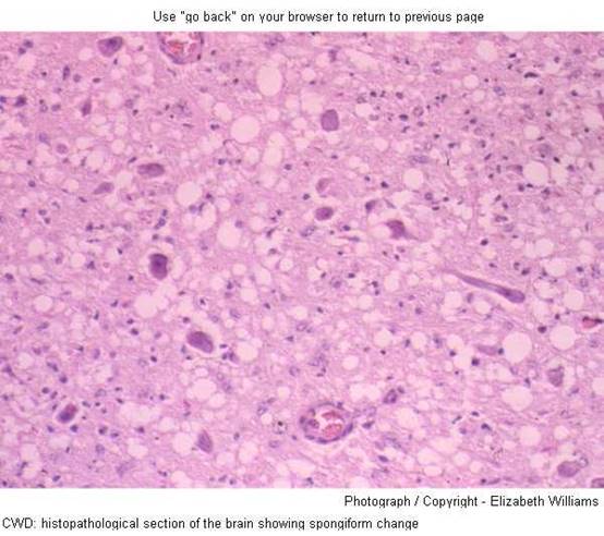脑组织的“空洞化”是受朊毒体影响的组织切片的特性,组织中会发展出“海绵状”的结构(图源:Wildpro)