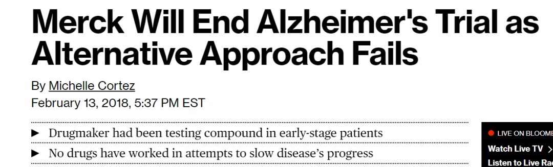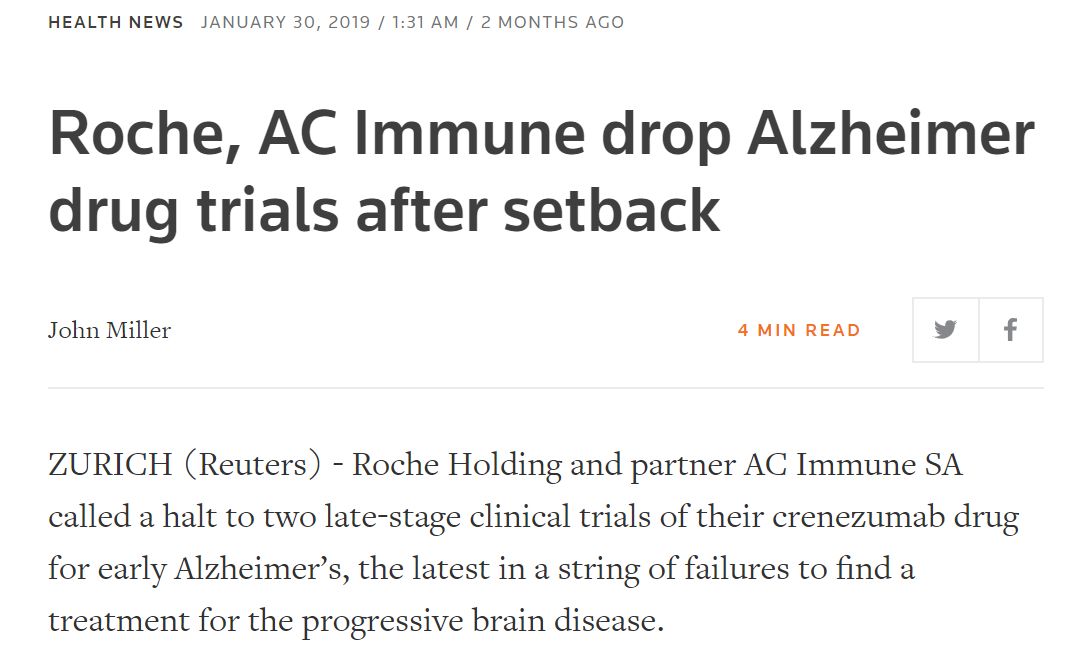 3月21日,美国百健(Biogen)制药公司发布声明,结束两项阿尔茨海默症实验性疗法的临床三期试验,因为基于试验中期数据分析推论药物可能无效(the compound was unlikely to be effective)。百健制药(BIIB)股价应声暴跌,跌幅高达30%。