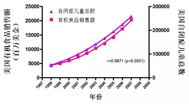 这个例子用的是美国实实在在的数据噢。图里红色的曲线是统计出来美国每年花在有机食品上的钱。紫色的曲线是美国自闭症儿童总数。这两条曲线的走势几乎完全一样,有99%的相关性。