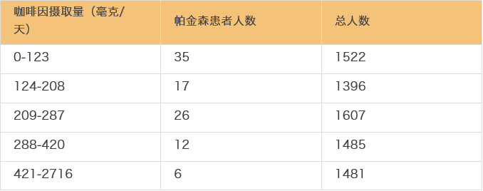 1. 在这个研究里面,即使在咖啡因摄取量最大的那个组(412-2716毫克/天),还是有6个人得帕金森综合症的,不是0。