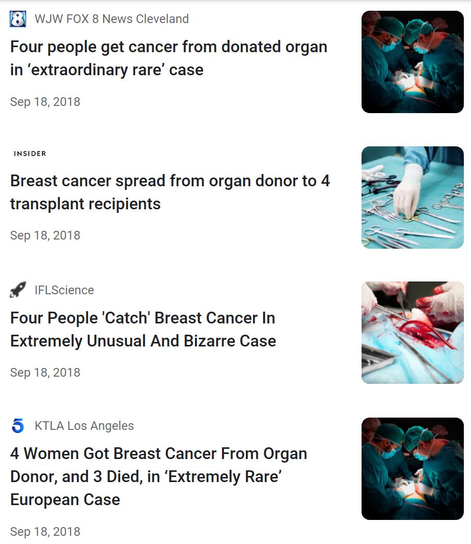 去年,American Journal of Transplantation 杂志报道了一个恶性肿瘤转移扩散的罕见病例,随后又被多家新闻媒体转载报道过(图1来自网络)。