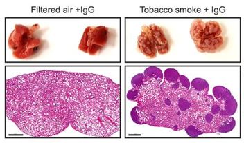 那,好端端的,肺部又为什么会发生炎症反应呢?有可能是因为细菌感染,也有可能是因为吸烟。最近有两项大型乳腺癌研究都发现了吸烟与乳腺癌的复发和死亡率有显著关联[12, 13],在Egeblad团队的乳腺癌小鼠模型中,曝露在香烟燃烧产生的烟雾中的小鼠,被香烟烟雾引发的肺部炎症,能唤醒扩散到肺部的休眠乳腺癌细胞,长出的乳腺癌转移病灶比不吸烟的小鼠要多得多[11](图6来自[11])。