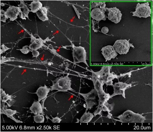 嗜中性粒细胞释放出NET,这是正常组织中炎症反应的重要组成部分。而Mikala Egeblad的团队则发现,在特定条件下,NET也可能会起到促进肿瘤转移的作用,当他们在小鼠里抑制NET,就能减少小鼠肺部的乳腺癌转移[9]。