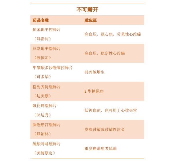 基于以上疑问,小编今日就为大家区分一下缓控释制剂,另附“家庭常用药能否掰开一览表”,供各位患者参考~