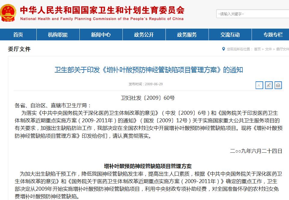 原国家卫生部于2009年6月启动了“增补叶酸预防神经管缺陷”重大公共卫生项目”,为有生育计划的妇女免费提供叶酸增补剂。
