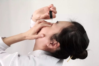 检查没问题后,将下眼皮轻轻拉起。点眼药时,滴眼液拿到眼睛上方1厘米,头稍后仰,眼睛朝头顶方向看,嘴巴自然张开,将眼药水滴入下眼皮结膜囊内,滴1-2滴后,把上眼皮轻轻地拎起来,然后慢慢地放下,轻压眼内角,转转眼珠,闭一会儿眼睛,让药液慢慢吸收,流出的液体用干净的纱布擦净。