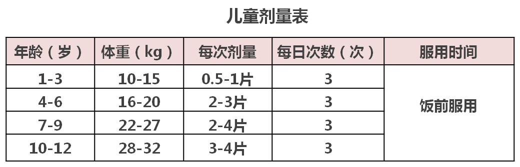 【用法用量】12岁以下儿童1片/次,每天3次,饭后嚼碎服用。12岁以上儿童及成人2-4片/次,每天3次,饭后嚼碎服用。
