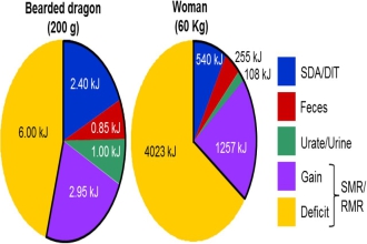 如果3天只吃芹菜,松狮蜥会损失6千焦热量,而女性人类会损失4023千焦热量(图片来源:参考文献1)
