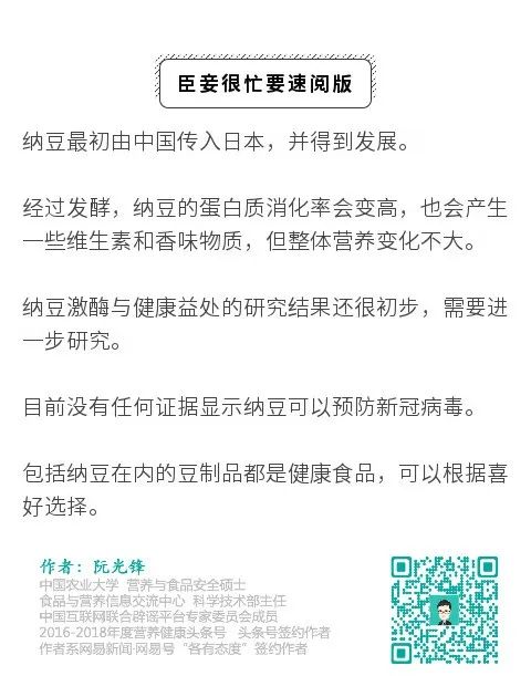 所以,如果喜欢吃纳豆,那就吃吧。只不过可别指望它预防新冠肺炎,还是做好防护,带好口罩,勤洗手。