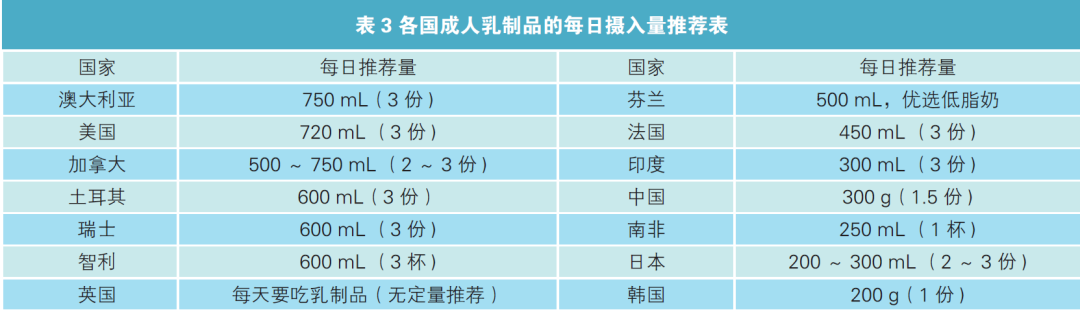 中国营养学界 30 多年来一直坚持推荐每人每日摄入 300 克牛奶或相当量的乳制品摄入量。从跟其他国家的对比看来,这个数量并不高,也是很安全的。比如澳大利亚的推荐量是 750毫升,美国是 720 毫升,印度是 300 毫升,而日本的推荐量是 200~300 毫升,只有南非(250毫升)和韩国(200克)比我国的推荐量低[9]。