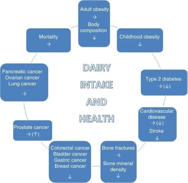 积极的效果可能与乳制品中的钙、乳铁蛋白、酪酸、共轭亚油酸和乳酸菌发酵产物等有关,而消极作用可能与酪蛋白和胰岛素样生长因子I (IGF-1)的含量有关。