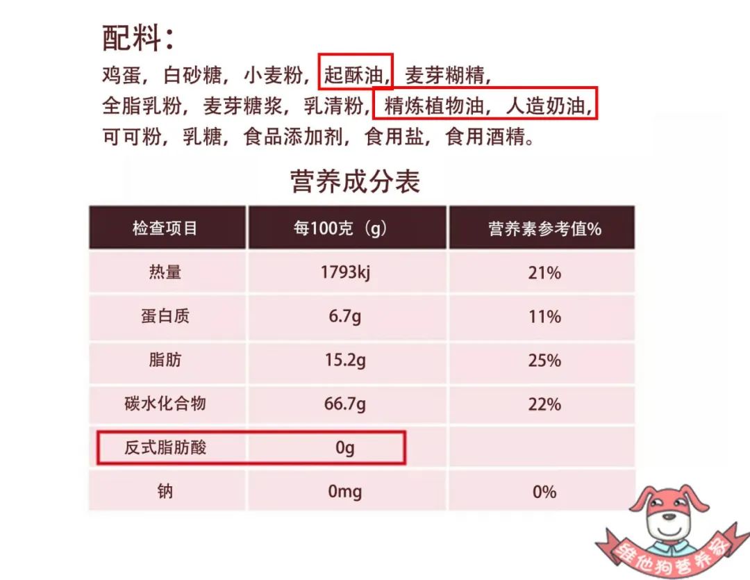 虽然营养成分中反式脂肪酸的含量为0克,但是我们在配料表中看到了起酥油、精炼植物油、人造奶油等,说明它还是含有反式脂肪酸的。