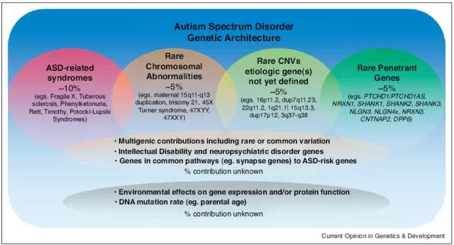 图1. 自闭症遗传结构图(来自Curr Opin Genet Dev. 2012;22:229-37)
