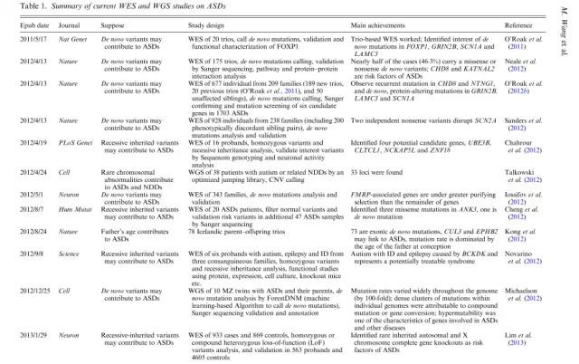随着测序技术的进步,通过对大量的自闭症家庭进行全基因组或者全外显子组扫描,科学家已经发现了大量自闭症相关的基因突变,这些突变,有些是遗传自父母的突变,有些是新发的突变(de novo mutation),有些是单个碱基的突变(点突变),有些是大的、复杂的结构变异。