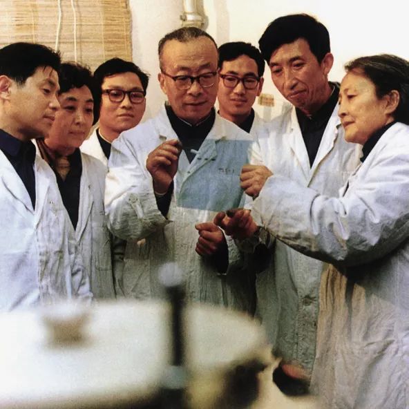 王德宝(中)与人工全合成酵母丙氨酸转移核糖核酸的合作者们在对放射自显影片进行分析讨论