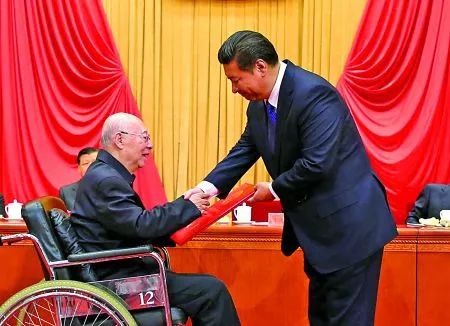习近平总书记为获得2014年度国家最高科技奖的中国科学院院士于敏颁奖