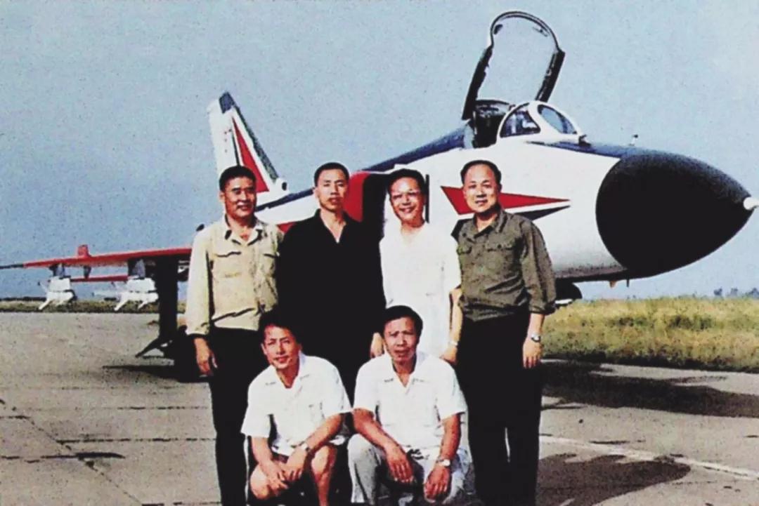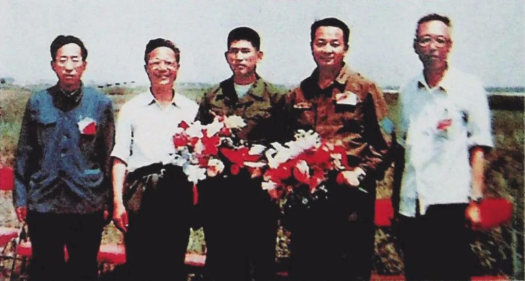 歼8Ⅱ飞机首飞成功后,温俊峰(左一)、顾诵芬(左二)、王昂(左四)、管德(左五)与试飞员曲学仁(左三)留影