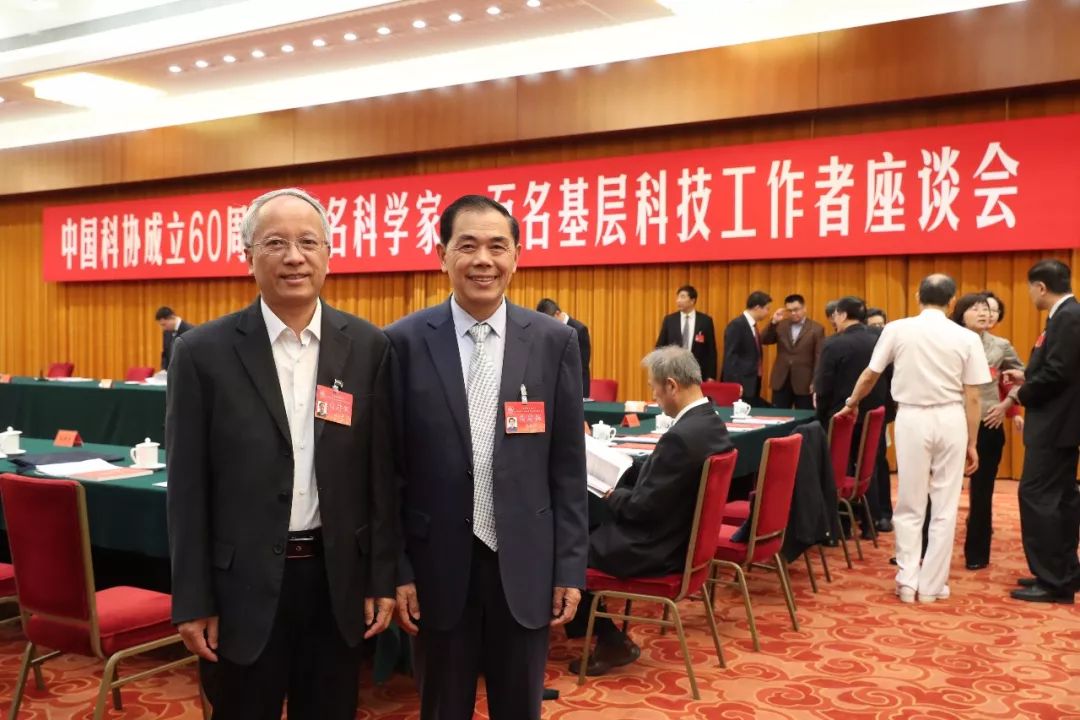 杨小牛院士(左)在2018年中国科协成立60周年百名科学家、百名基层科技工作者座谈会上