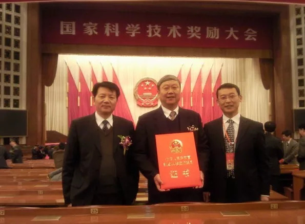 芮筱亭院士(左)与李凤生教授(中)、杨健教授(右)在人民大会堂参加国家科学技术奖励大会