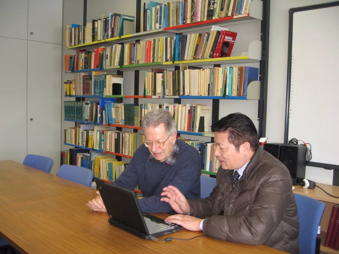 芮筱亭院士(右)与国际力学联合会原主席Werner Schiehlen教授交流