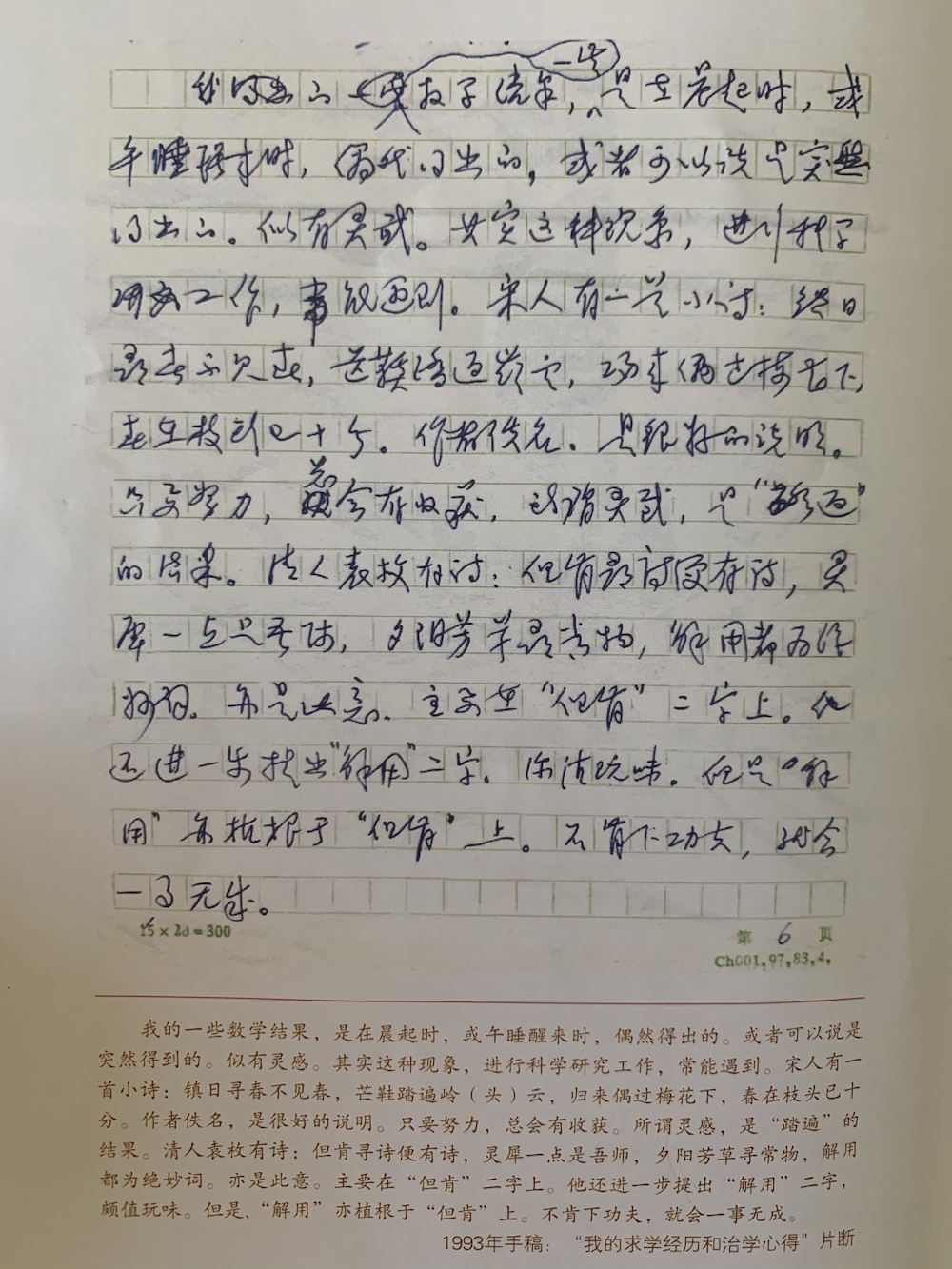 古人有诗云:“终日寻春不见春,芒鞋踏破岭头云。归来偶把梅花嗅,春在枝头已十分。”作为中国科学院资深院士的柯召先生曾经引用这首小诗来总结自己做学问的心得,“我的一些数学结果,是在晨起时,或者午睡醒来时偶然得出的。或者说,是突然得到的,似有灵感。这种情形,进行科学研究工作常能遇到。只要努力总会有收获。所谓灵感,是‘踏遍’的结果。”