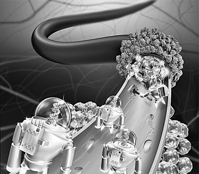 利用纳米医学机器人实现对人类重大疾病的精准诊断和治疗是科学家们追逐的一个伟大梦想。国家纳米科学中心聂广军、丁宝全和赵宇亮研究组与美国亚利桑那州立大学颜灏研究组等合作,在活体内可定点输运药物的纳米机器人研究方面取得突破,实现了纳米机器人在活体(小鼠和猪)血管内稳定工作并高效完成定点药物输运功能。研究人员基于DNA纳米技术构建了自动化DNA机器人,在机器人内装载了凝血蛋白酶——凝血酶。该纳米机器人通过特异性DNA适配体功能化,可以与特异表达在肿瘤相关内皮细胞上的核仁素结合,精确靶向定位肿瘤血管内皮细胞;并作为响应性的分子开关,打开DNA纳米机器人,在肿瘤位点释放凝血酶,激活其凝血功能,诱导肿瘤血管栓塞和肿瘤组织坏死。这种创新方法的治疗效果在乳腺癌、黑色素瘤、卵巢癌及原发肺癌等多种肿瘤中都得到了验证。