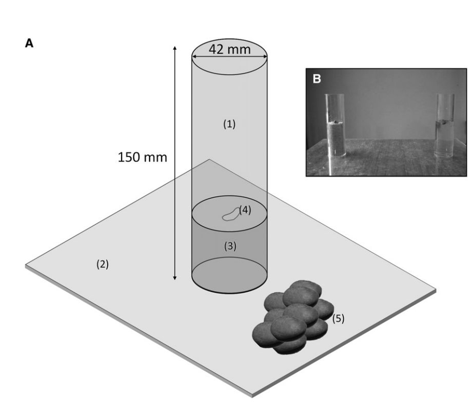 试验一:给乌鸦提供了10块大石头(平均14.0±0.3克),每块石头都可以将水位提高4毫米。如果水位低于可到达高度(乌鸦可以吃到虫子的高度)4毫米,则乌鸦只需将一块石头放入管中,而如果水位低于可达高度28毫米,则必须放下7块石头。
