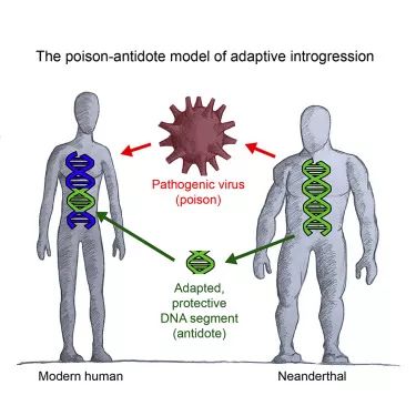 2018年10月,来自美国亚利桑那大学的戴维·恩纳德(David Enard)和斯坦福大学的德米特里·佩特罗夫(Dmitri A. Petrov)在《细胞》杂志上报告称,尼安德特人和古代智人在混交过程中,不仅相互传播病毒,而且还将病毒互作蛋白(VIP)基因遗传给双方混交的后代。VIP蛋白具有多种功能,比如参与免疫反应,能抵抗特定病毒、特别是RNA病毒的入侵。由于基因突变,有些尼安德特人的VIP蛋白能对抗某些特定病毒,特别是RNA病毒的入侵。这样,遗传有尼安德特人VIP基因的智人后代将获得应对更多病毒的抵抗力,即遗传适应性,得以在之后的大规模瘟疫中幸存,而那些非混交后代则被逐渐被淘汰。《福布斯》撰稿人珍妮弗·拉夫(Jennifer Raff)博士将这一现象形象地比喻成尼安德特人和古代智人既互相放毒,又相互提供解药。