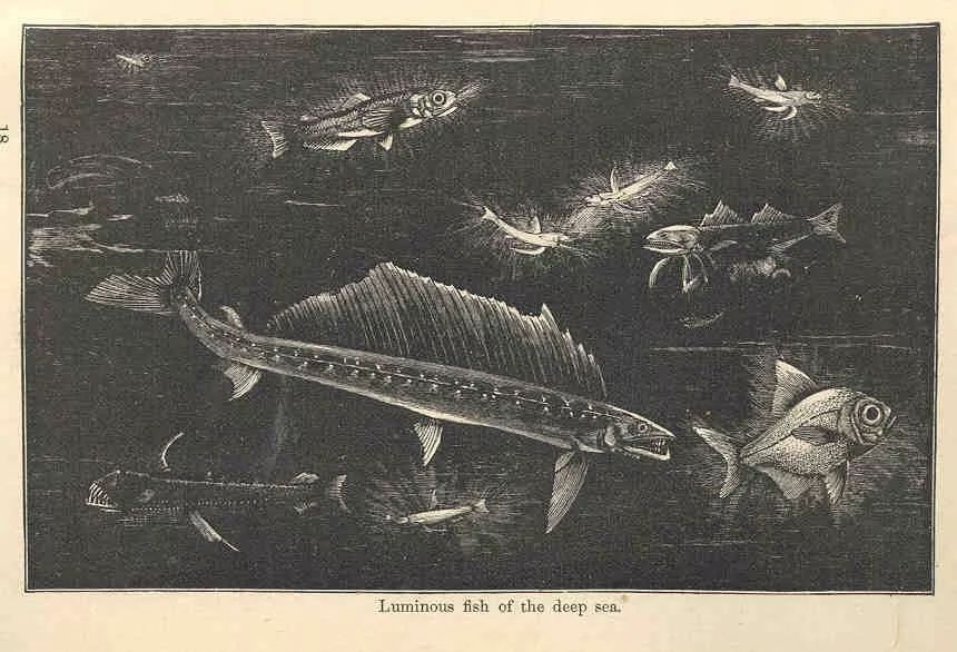 各种深海鱼类的世界,可能不是这样黑白打印的哦。图片来源: Wikimedia Commons.