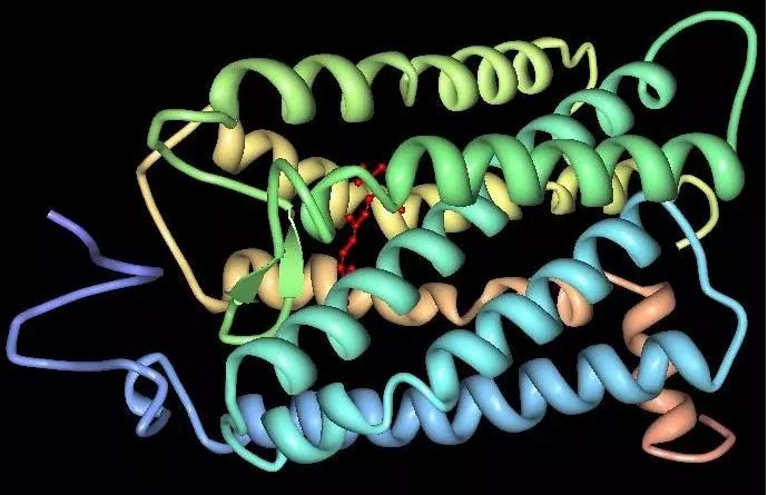 牛的视紫红质蛋白三维结构,注意中间那个红色的小分子就是视黄醛。图片来源:Palczewski et al, Science, 2000.