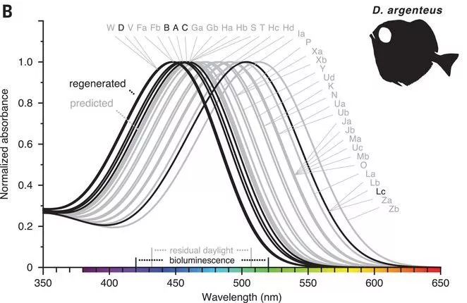当然,研究做到这里,我们仍不能确定地说“银眼鲷的视杆细胞能形成彩色视觉”,这需要行为学的实验来进一步验证。不过,银眼鲷的视杆细胞所跨越的447-513纳米这个色彩区间,恰好是在微光区最常见的、偶尔穿越上层海水的光线波长,因此拥有对蓝绿光敏感的视紫红质对于这些深海鱼类来说很可能是有利的;而这个区间也是各种浮游生物的荧光波长所在,这么看来能够区分不同的蓝和绿就更有意义了。
