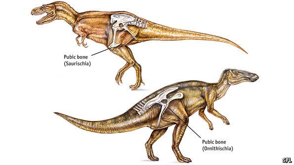 蜥臀类和鸟臀类的骨盆构造,可以对比前面镰刀龙的骨骼图看看比较接近哪一种?(图片来源:https://www.economist.com/science-and-technology/2017/03/23/a-new-way-to-classify-dinosaurs)