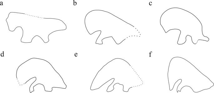 镰刀龙类骨盆比较,a、b分别为较为原始的铸镰龙、北票龙,c为凌原龙,d、e、f则为特化的肃州龙、南雄龙以及慢龙。(图片来源:Yao et al., 2019)