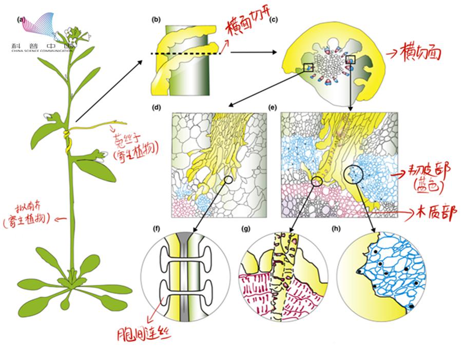 菟丝子通过吸器吸收养分示意图,来源:作者自制