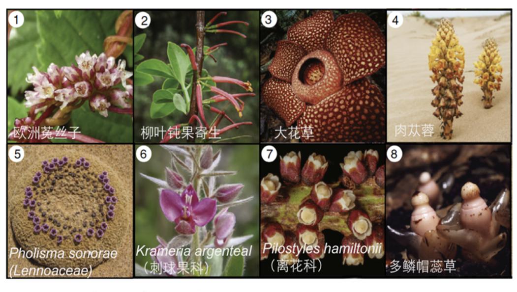 除了嫁接的种内基因转移,发生在种间的基因转移也十分常见。植物按照获取营养物质的方式可分为两种:自养型和异养型。自养型是指通过植物叶片中的叶绿素将光合作用产物转化为有机物供自身生长所需;异养型植物主要指各种寄生植物,它们不能进行光合作用,要寄生在其他植物体上,汲取水分和营养才能生存。植物的种间基因转移主要发生在寄生植物和其寄主之间。寄生植物有上千种,我们所熟知的有菟丝子,列当和独脚金等,部分寄生植物如下图所示。