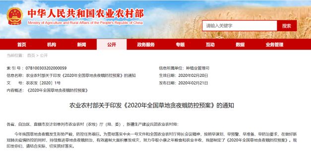 2月20日,中国农业农村部发布《全国草地贪夜蛾防控预案》 | 官网截图