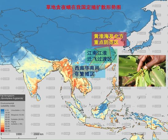 草地贪夜蛾在我国定殖扩散形势图(图中颜色越红的区域表示虫害越重) | 作者供图