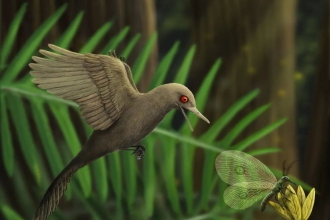 眼齿鸟这种小型化过程,通常发生在封闭的环境中。而一亿年前的缅甸北部,正是一个孤立的岛屿。我们可以想象在距今约9900万年前,一只体型娇小的眼齿鸟正在潮湿的森林中觅食,突然它发现了不远处的南洋杉上,有一只被流下的树脂粘住的甲虫。眼齿鸟赶紧拍打着翅膀飞到甲虫身边,一口将其叼住,经过不断的拉扯才将甲虫从粘稠的树脂中拽出吞下。
